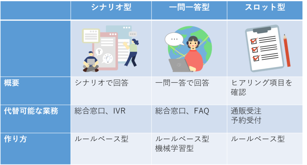 作り方や答え方によって、チャットボットはいくつかの種類に分けることができます。それぞれに特徴があり、できることも変わってくるため、コンタクトセンターでの導入時には理解しておく必要があります。