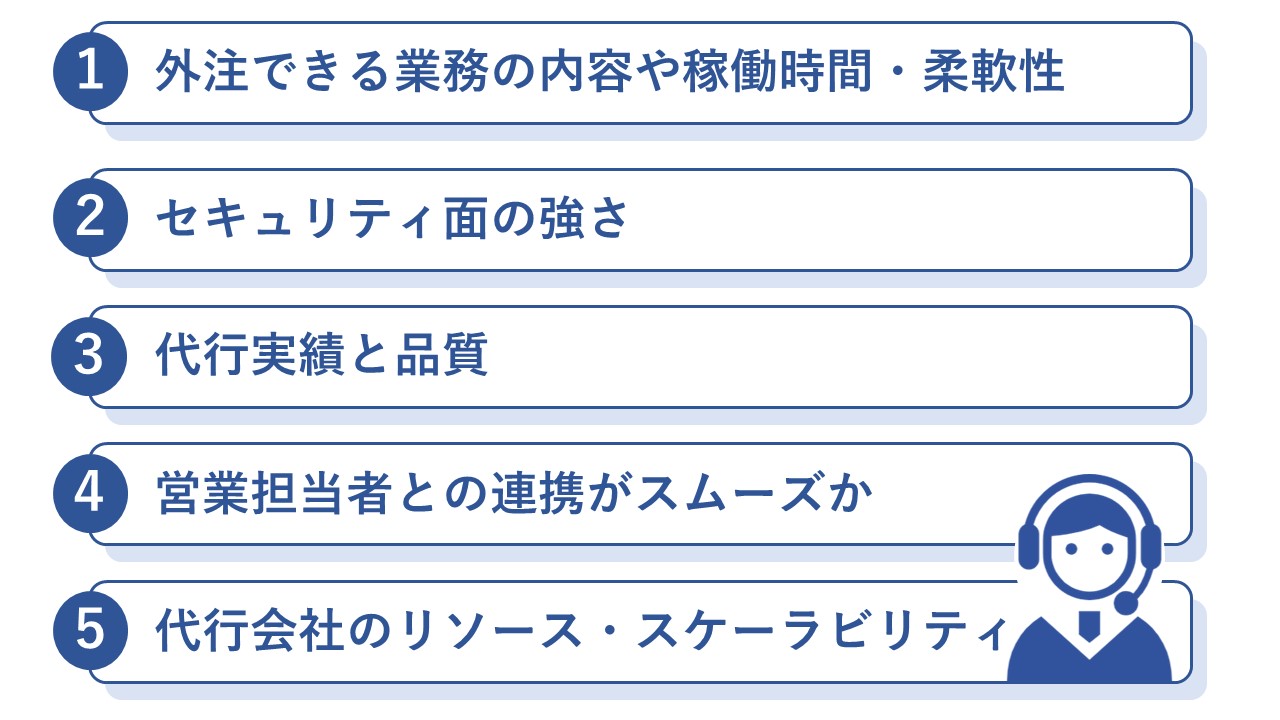 1.委託できる業務の内容や稼働時間・柔軟性 2.セキュリティ面の強さ 3.実績やクオリティ 4.代行担当者との連携がスムーズであるか 5.費用とサービス内容のバランス などです。