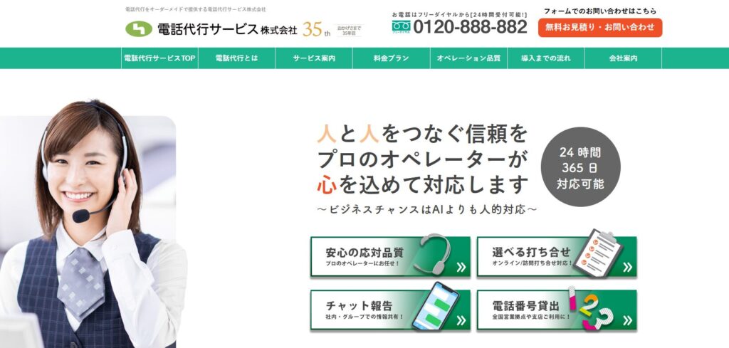 35年の実績を持つ電話代行サービス株式会社は、「顧客満足」と「情報保護管理」を重視したオペレーター教育を実施。秘書代行・夜間休日・コールセンター代行の3つの料金形態があり、1か月無料のお試しキャンペーンがあります。