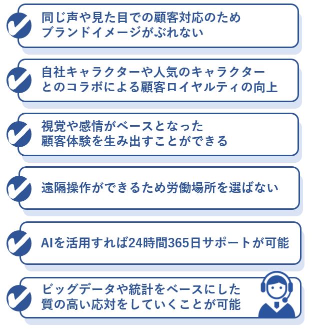 さらには、合成音声やCGの技術を使えば、さまざまな声や見た目を再現することができます。有名なキャラクターや有名人とのコラボができれば、通常のオペレーターが対応するより高い顧客ロイヤルティが期待できるでしょう。