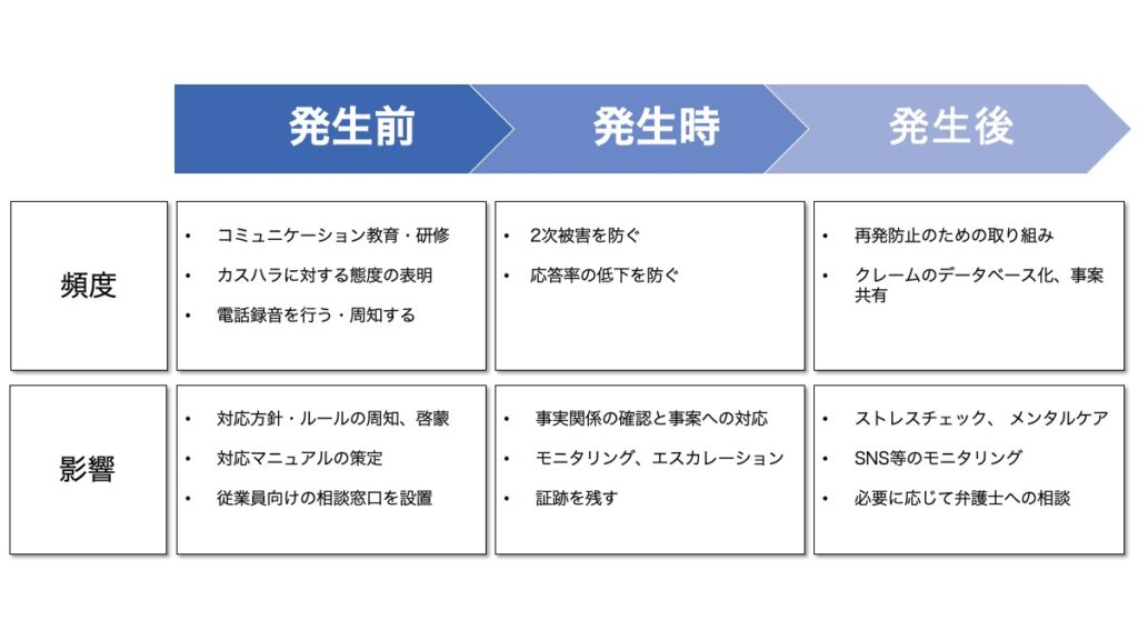 カスタマーハラスメントというリスクを最小化するためには「発生する頻度を下げるか」と「発生した際の影響を小さくできるか」の2つにかかっています。また、「発生前」「発生時」「発生後」のフェーズごとでそれぞれ2つのリスク要因に対して何ができるかを整理しておくとよいでしょう。