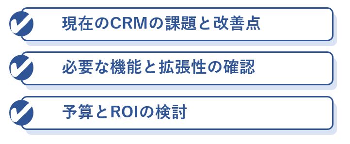 課題を明確にした上で、それぞれに対する改善点を洗い出します。次期CRMで改善すべき点は何か、それが実現した場合にどのような結果を期待できるかを理解し、リプレイスに向けた準備を進めましょう。これらの情報は、新しいCRMを選定する際の重要な基準となります。