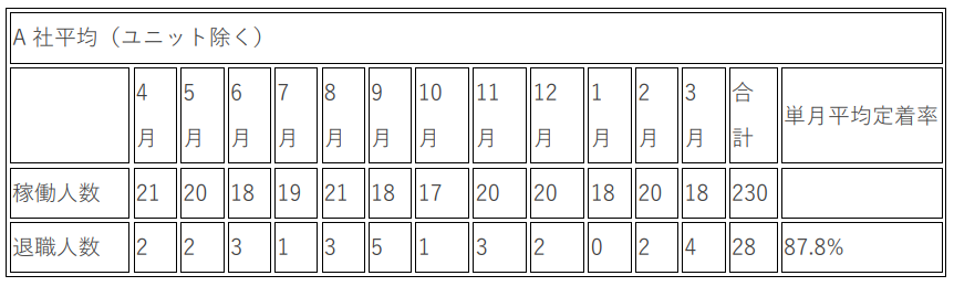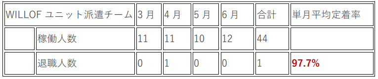 上記表を見ていただくと、ウィルオブ・ワークのユニットチーム発足後、早期離職を防ぎ安定稼働が出来ていることがお分かりいただけるかと思います。
