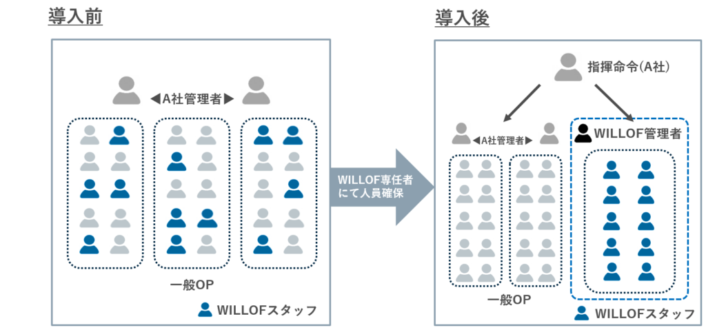 さらに、ウィルオブ・ワークの管理者(フィールドサポータ)が現場に常駐し、ウィルオブ・ワークの派遣スタッフの管理を行う体制を整えました。現場での直接指導が可能となり、現場での情報集約・早期フォローが可能となるため定着率の改善を見込んでいました。