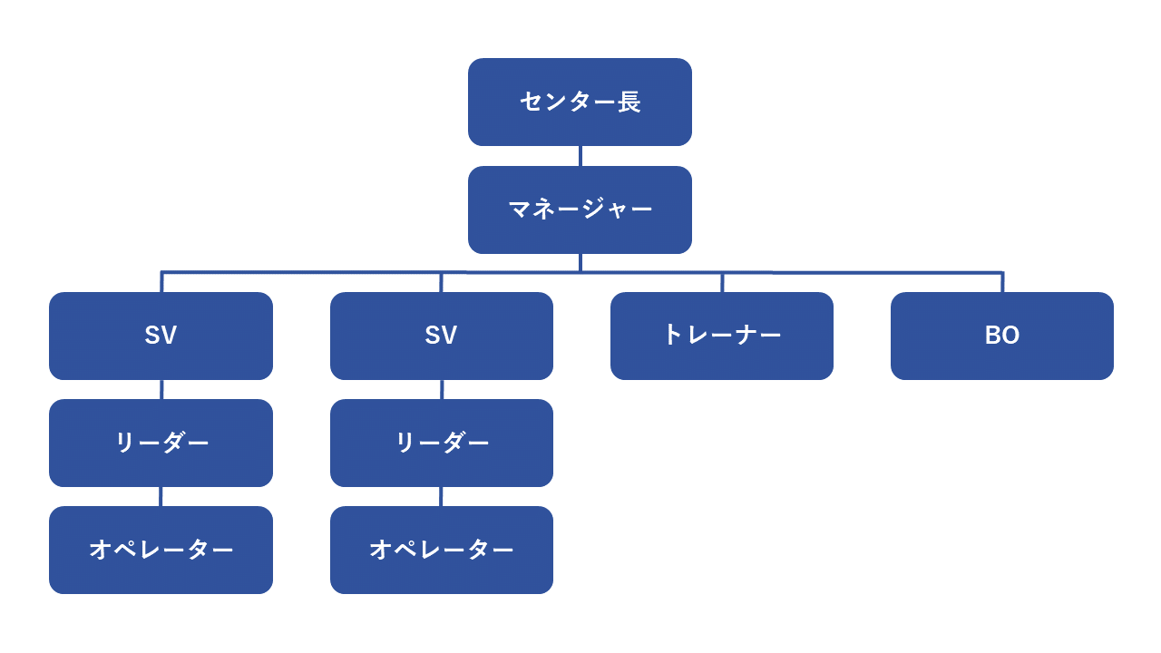 コールセンターの一般的な組織構成を見てみると、基層にはオペレーターが位置し、その上にリーダー、さらにその上にSVが続き、マネージャーやセンター長が組織のトップとして位置します。