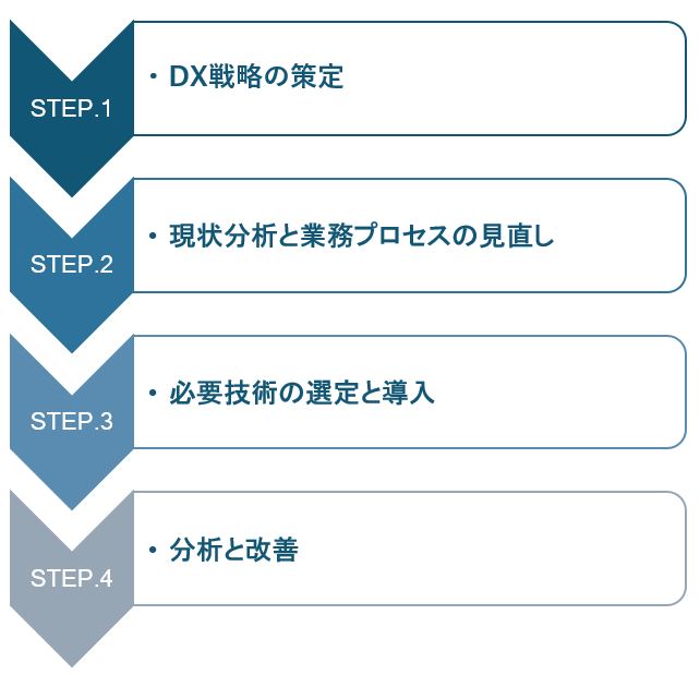 コールセンターのDX実現に向けたステップは、戦略の策定から始まり、現状の業務プロセスの分析・見直し、必要な技術の選定・導入、そして継続的な分析と改善などが必要です。この章では各ステップについて詳細を説明します。
