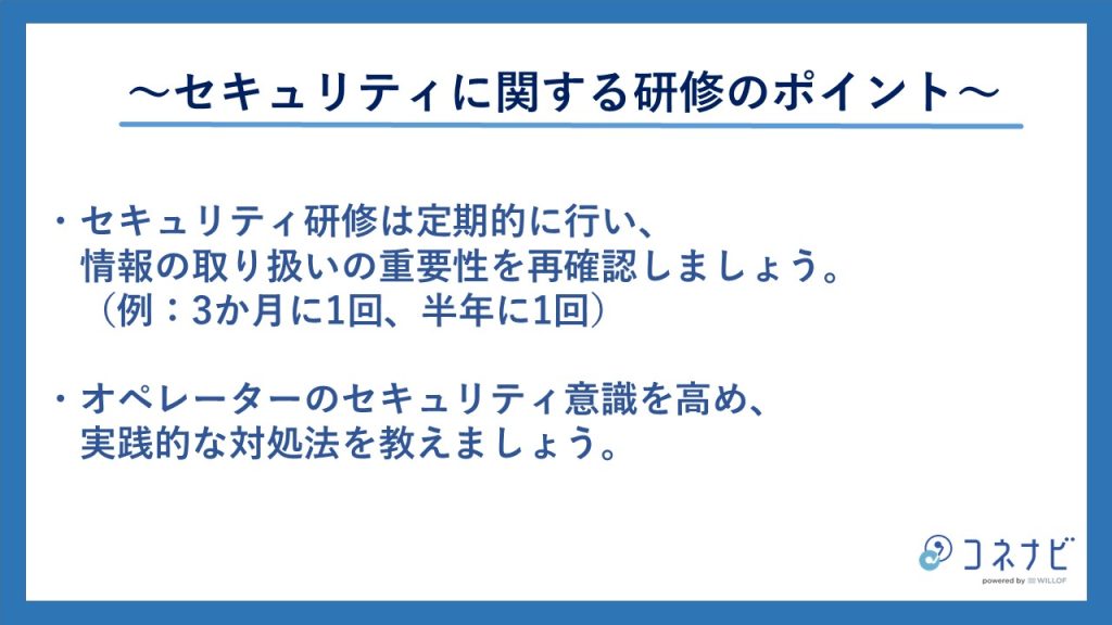 社内のセキュリティ対策にはさまざまな方法がありますが、まずは個人や会社の機密情報を扱うオペレーターに対して、セキュリティ研修を徹底して実施する必要があります。法律や社内規定に関する説明を通じて遵法意識を高めた上で、機密情報の取り扱い方法や不審な電話に対する適切な対処方法を教える研修を行います。