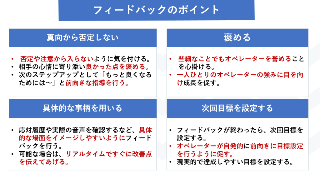その人に合わせたフィードバックを実施することも、オペレーター教育において重要なポイントです。オペレーターの性格やスキルレベルは人それぞれ異なります。定期的に行う面談やモニタリングを通じて、ひとりひとりのオペレーターと向き合い、性格やスキルレベルに応じた適切なフィードバックを実施することを意識しましょう。