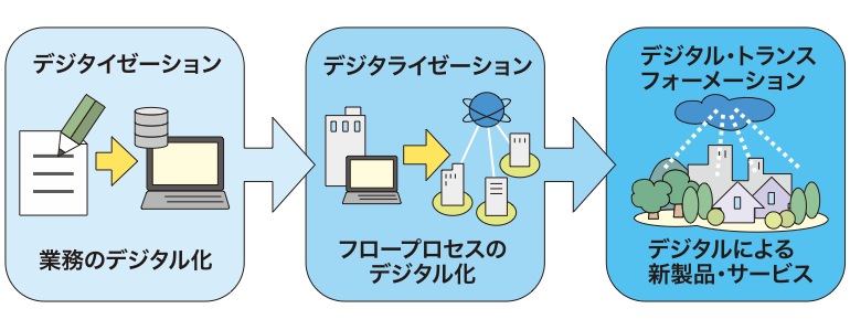デジタル化には、適用範囲や目指す方向性によって、デジタイゼーション、デジタライゼーション、デジタルトランスフォーメーション(DX)と大きく3つのフェーズがあります。