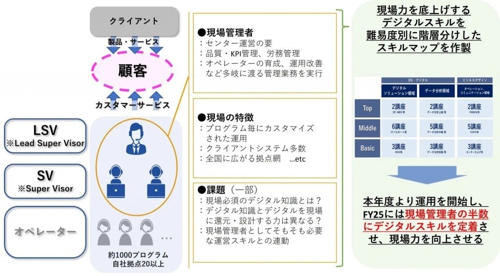 背景として、同社では300社以上の取引先に1,000件を超えるBPOサービスを提供していますが、クライアントごとにカスタマイズされたサービスのため、画一的なDX導入が困難でした。そこで、現場管理者自身にDXスキルと知識を習得させることで、効率的で付加価値の高いオペレーションの実現を目指す方針へと切り替えています。 今後の展望として、初年度は階層合計で60人を、3年後の2025年度には現場管理者の半数がデジタルスキルを習得し、センターが運営される状態を目指しています。