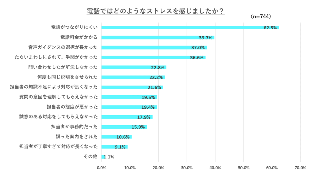 大手BPOサービス会社トランス・コスモス社が実施した「カスタマーサポートに最もストレスを感じる状況」に関する調査では、60%以上の顧客が「電話がつながりにくい点」と回答しています。