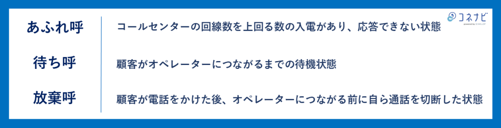 「あふれ呼」と類似した用語には、「待ち呼」・「放棄呼」があります。