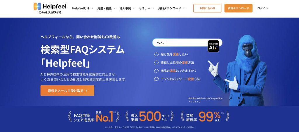 helpfeelの特長は、革新的な業務効率の向上とリスク回避を両立したAI活用にあります。FAQや問い合わせフォームでの顧客接点から、ログ分析、質問文の生成まで、幅広い業務プロセスの効率化を実現しています。独自の検索技術に米OpenAI社のAI技術を組み合わせることで、高速な検索と自然な文章での回答精度を両立させています。生成AIと人間の知見を組み合わせることで、質問の予測パターンを約50倍に拡張しています。特筆すべきは、FAQの回答記事とその意図表現を人間が作成する仕組みにより、AIによる誤った回答や偽情報(ハルシネーション)のリスクを排除している点です。この特長により、金融、医療、行政など、特に高い情報の正確性が求められる業界でも安心して利用することができます。