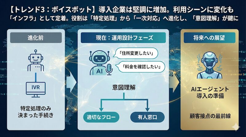 AIエージェントや生成AIといった華やかなキーワードの陰で、着実に、そして深く浸透していたのが「ボイスボット(音声対話システム)」です。 数年前までは「IVRの代わりになるか?」という検証段階でしたが、今やコンタクトセンター運営における不可欠な「インフラ」として定着しています。