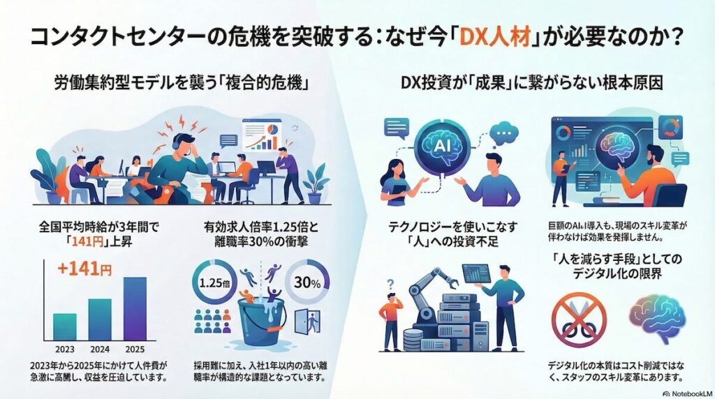 コンタクトセンター業界は現在、かつてない複合的な危機に直面しています。人件費の高騰、有効求人倍率1倍以上という採用難、そして入社1年以内の離職率の高さ、これらの構造問題が、長年の「労働集約型モデル」の限界を露わにしています。